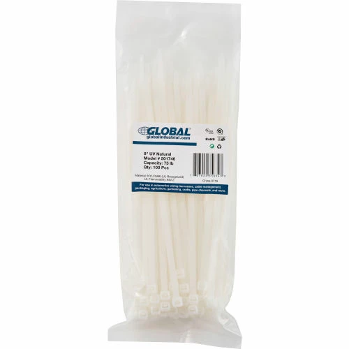 Global Industrial 8″ Cable Zip Ties, Natural w/UV, 75 lb, 100 pack