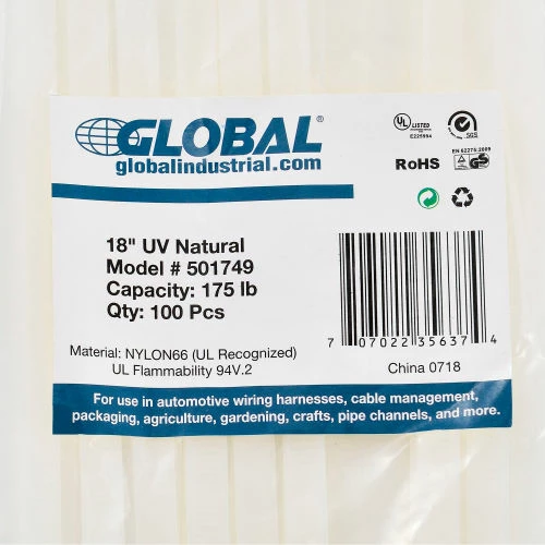 Global Industrialâ„¢ 18″ Cable Zip Ties, Natural w/UV, 175 lb, 100 pack